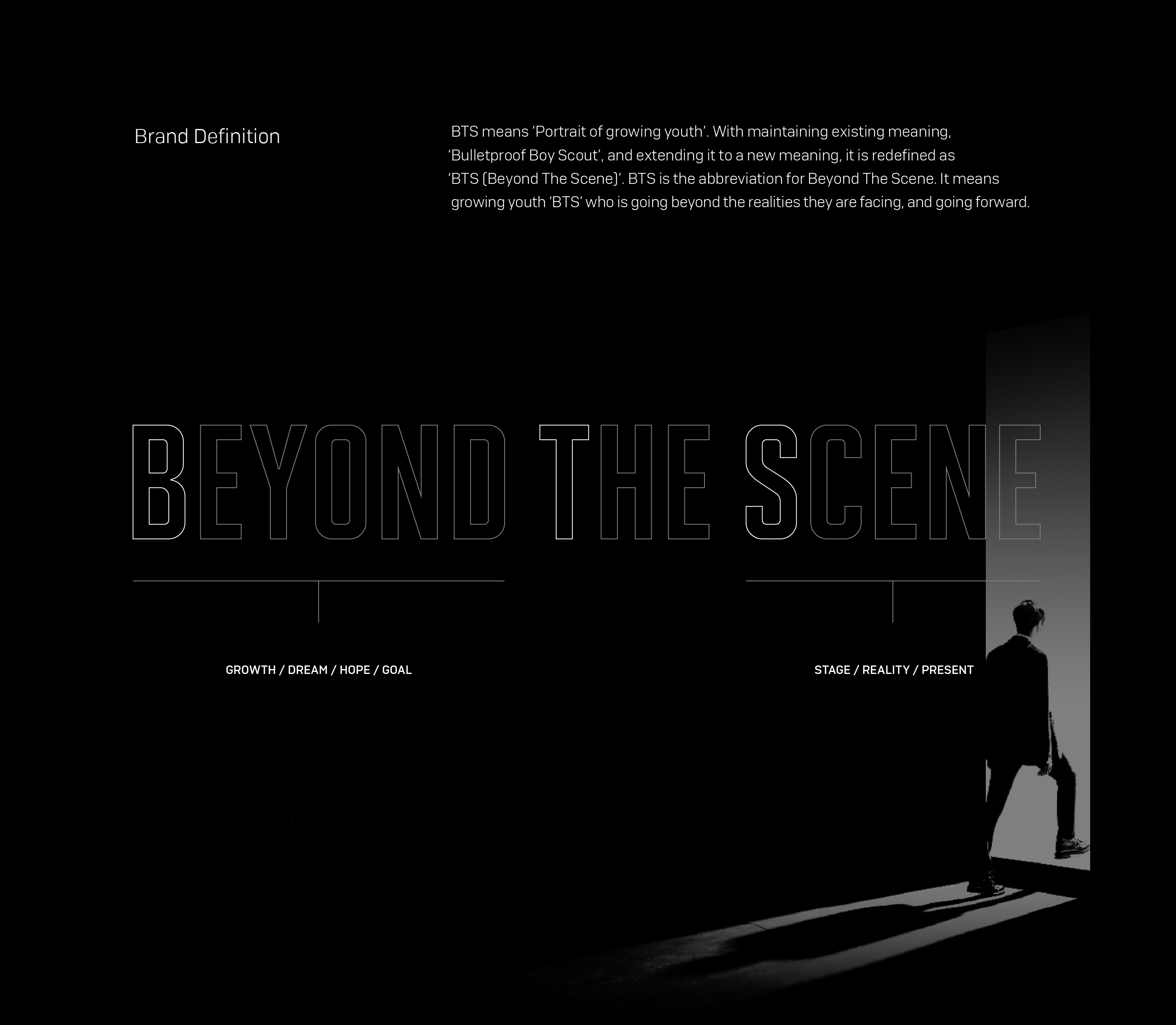 국내 뿐 아니라 국외에서 자신의 이야기를 진정성 있게 전달하며 왕성하게 활동하는 그룹입니다. 데뷔 초에서 지금에 이르기까지, 변화하는 각 앨범의 컨셉이나 활동을 통해 '성장'의 서사를 보이며, 동시대를 살아가는 청춘들의 목소리를 대변하는 방탄소년단을 BTS(Beyond The Scene)로 재정립하였습니다. 소년에서 어른으로 성장하며 수많을 문을 마주하는 방탄소년단의 심볼은 현실에 안주하지 않고 성장하기 위해 새로운 세상으로 나아가는 브랜드 스토리에서 출발하여, 이를 열고 나아갈 때의 문으로 표현하였습니다.