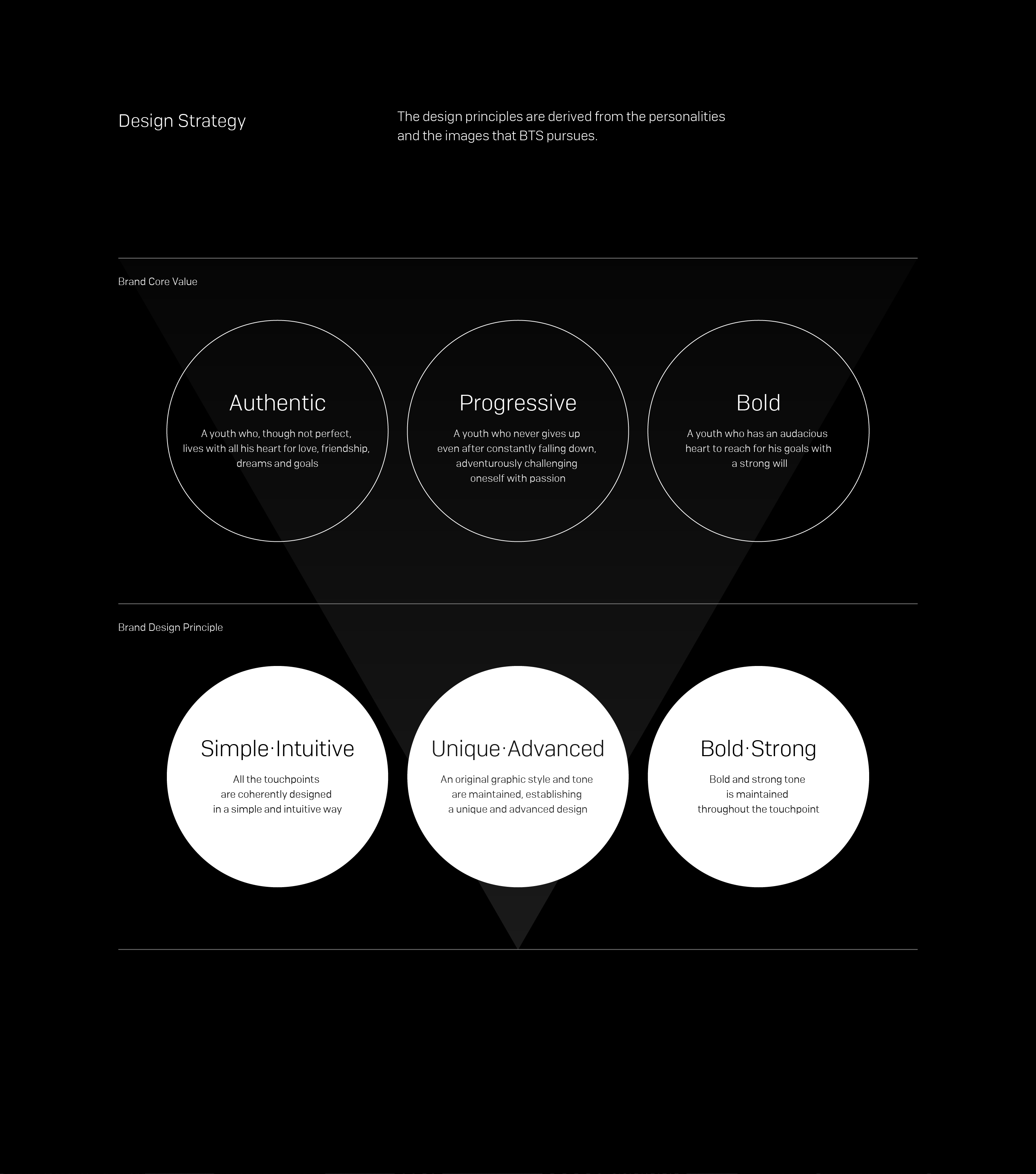 또한 방탄소년단의 팬덤인 A.R.M.Y는 서로의 모습을 끊임없이 반영하며 상호 지속적인 영향을 주는 관계입니다. A.R.M.Y의 심벌은 방탄소년단이 새로운 문(앨범)을 열었을 때 그 맞은편에서 환영하며 기다리고 있는 팬덤의 시점에서 보이는 문으로 표현하여 조형적, 의미적 연계성을 부여하였습니다. 뿐만 아니라, 브랜드 스토리에서 자연스럽게 파생된 여는 행위와 빛을 활용한 브랜드 모티프, 그리고 지정서체, 컬러, 텍스처를 지정하여 완성도 높은 아이덴티티를 구축하고, 이러한 요소들을 온/오프라인 다양한 접점에 일관되게 적용하여 방탄소년단만의 특별한 브랜드 경험을 제공하고자 하였습니다.